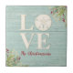 Un carrelage en céramique sur le thème de la plage avec le mot amour, et personnalisé avec votre nom en dessous. Un coquillage de sable dollar crée le "o" dans le mot amour. Ce dessous de verre a un arrière - plan en bois texturé patiné et les coins sont décorés d'herbes de mer. Ce carrelage en céramique de sable en dollar est un grand complément à votre décor de plage, et fait également un grand cadeau. Conçu pour vous par Blackberry Boulevard.