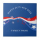 Un drapeau américain abstrait avec étoiles et rayures en rouge blanc et bleu. Joyeux 4 Juillet texte personnalisé et nom de famille. Design patriotique moderne.