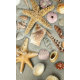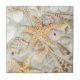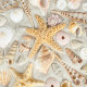 Une collection dynamique de coquillages et d'étoiles de mer éparpillés sur une surface sablonneuse. La scène présente une variété de textures et de couleurs, des coquilles lisses aux étoiles de mer rugueuses et naturelles.