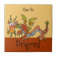 Une illustration de dragon de dessins animés fantaisie sur ce carrelage est en marron, or, orange, avec un bleu pâle dessous. Vous pouvez modifier du texte pour créer votre propre cadeau personnalisé. Besoin d'aide, envoyer un courriel à lilly@lillyarts.com