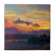 Un design artistique d'un beau coucher de soleil montrant également des rochers, la plage et un homme de pêche.