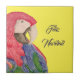 Tuile en céramique Feliz Navidad macaw avec perroquet rouge sur un arrière - plan jaune. Le lettrage bleu peut être customisé avec votre propre message. Idéal pour souhaiter un Joyeux Noël avec un thème du Mexique.