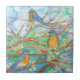 Un beau carreau de céramique à thème nature avec trois bleuets perchés dans un arbre en fleurs au printemps avec fleurs blanches dessinées à l'encre sépia avec aquarelle.