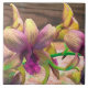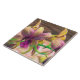 Les orchidées fleurissent encore dans le jardin, dans la photographie originale sur ce carreau de céramique. Les fleurs, émergeant d'une tige verte courbante, ont des centres pourpres qui se mélangent dans le jaune aux bouts des pétales. L'arrière - plan en bois naturel place outre des formes et des couleurs sculpturales.