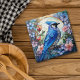 Sur ce carrelage en céramique, une belle baie bleue perche dans un cercle de ciel clair. Le cercle et l'oiseau sont entourés et recouverts de fleurs et de bourgeons bleu pastel, rose et orange. Une superposition a été ajoutée pour donner un aspect de vitrail. Joli !