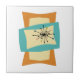 Cette carreaux de céramique moderne du milieu du siècle funky présente des formes rectangulaires serrées et étirées dans les couleurs bleu turquoise, crème et orange. Les accents Starburst en rose, bleu, or et noir mettent en valeur le design. Ajoutez cet accent rétro funky à votre projet de carrelage !