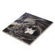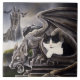Le chaton tuxedo noir et blanc est assis à côté d'une gargouille. Derrière eux se trouve un château et des dragons.