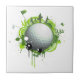Illustration moderne avec le golf comme thème. Une balle de golf représente la Terre avec des golfeurs et des drapeaux autour en tons verts. Design moderne et amusant pour les amateurs de golf.