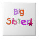 Big Sister garde des boîtes de saké, carreaux, ornements, carnets, coussins, tasses, autocollants, magnets, et plus avec le design de texte vert, rose, orange et violet brillant!