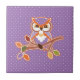 " C'est automne ! Saisissez ce hibou mignon de point de polka pour votre table de vacances. La conception inclut un grand hibou lilas de point de polka se reposant sur une branche décrite dans blanc et orange. L'arrière - plan sur cette tuile adorable est lilas avec le pois blanc."