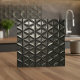 This ceramic tile features a bold, industrial-inspired geometric pattern rendered in a distressed iron finish. The design showcases a repeating lattice of angular lines and metallic textures that give the surface the look of aged wrought iron—strong, structured, and sophisticated. Its dark gray and charcoal tones create a dramatic statement perfect for modern, urban, steampunk, or industrial-loft décor. This tile brings depth and visual interest to backsplashes, accent walls, tabletops, and all your custom home decor projects. Search ID1227 to see other metallic geometric designs in this series. Note: design adapted from generative content.