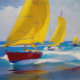 "J'ai vu trois bateaux" Paysage marin. Un paysage marin coloré et reposant dans le style d'une aquarelle. Avec des voiliers dans une mer agitée. Couleurs bleu et jaune vifs.