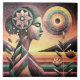 Graphisme abstrait coloré d'une femme ornée de fleurs, de soleil et d'étoiles, avec un effet aquarelle et des textures.