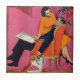 Artiste : Morgan Kane | Un homme s'allonge sur une chaise rouge vif lisant le journal, et une femme est assise sur le bras
