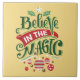 Tuile en céramique avec illustration cool. Texte dit Croire à la magie en lettres fantaisistes. Décoré de boules de noël.