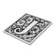 Lettre lumineuse médiévale J Carrelage en céramique Un vecteur noir et blanc illustration de la lettre dans un style médiéval élaboré, créé dans le style d'Albrecht Dürer. Le design est un carré avec un grand motif floral central entouré de motifs et tourbillons géométriques symétriques.