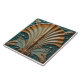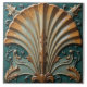 Un design de coquillages surélevé et stylisé au centre, avec une palette de couleurs turquoise, or et crème. Le coquillage est composé de segments nervurés qui s'échappent d'une tige centrale, avec la peinture dorée qui semble en détresse, révélant de la crème en dessous. L'arrière - plan est turquoise, orné de motifs ornés, tourbillonnants et de motifs floraux en or et crème. L'ensemble rappelle des détails architecturaux vintages, avec une texture un peu patinée qui ajoute à son charme d'antan.