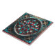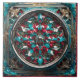 Un radial complexe, abstrait de pièces rouges et bleues, mélangé ensemble, placé dans un cercle argenté dans un cadre complexe et orné.