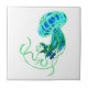 une aquarelle décorative d'une méduse bleue et verte aux tentacules turquoise sur un carrelage en céramique.