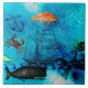 Une pieuvre attaque un navire tandis qu'une baleine et un poisson passent à la nage. Thème nautique vintage sur un arrière - plan bleu. La plupart des images vintage proviennent de la Biodiversity Heritage Library.