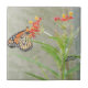 An orange and black Monarch butterfly sips nectar from a Tropical Milkweed bloom. On the Sam plant, a Monarch caterpillar, eats the leaves of it's preferred host planifie.