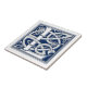 Une belle lettre céleste en relief décoratif illuminée de têtes de dragon gris sur un arrière - plan bleu foncé velouté.