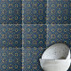 Décor moderne en céramique moderne de style ethnique avec un motif sans couture aux formes géométriques jaune, marron et turquoise sur un arrière - plan bleu profond.