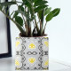 Elégant design en céramique vintage avec un motif transparent aux formes géométriques jaune, blanc, gris clair et gris foncé.