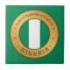 The national flag of Nigeria is encapsulated in a faux gold ring shape. Around the outer of the ring, are two parts of text with the official name of Nigeria and the country name.