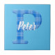 Nom du garçon avec lettre P initiale. Impression motif plaid bleu. Carrelage décoratif en céramique pour la chambre des garçons. Le texte peut être modifié pour rendre cette mosaïque unique.