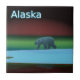 Un ours polaire arpente la glace pendant la longue nuit polaire; les aurores boréales en rouge et vert au loin. Le texte "Alaska" en bleu et blanc brillant apparaît également.