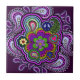 Un carrelage au design psychédélique coloré avec des fleurs abstraites, un coeur et un signe de paix. Tout est entouré de paisley violet.