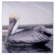 Profil d'un pélican - le pélican brun dans la photo originale sur ce grand Carrelage en céramique planant le long de l'eau d'un canal sur la côte du Golfe de Floride. Le côté d'un bateau dans l'arrière - plan montre les reflets chatoyants de l'eau bleue. La photo est dans les tons bleus, gris doux et marron, avec une touche de jaune sur la tête du pélican. Le carrelage est disponible en deux tailles et en option pour le cadrage.
