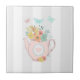 Tuile en céramique avec illustration fantaisiste. Une théière rose avec un petit coeur rose au centre et un bouquet de fleurs à l'intérieur. De délicieux papillons de couleur pastel floutent autour. Placé sur un arrière - plan rayé gris et blanc.
