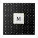 Un motif de point blanc de polka est sur un arrière - plan noir. Le monogramme noir est sur un carré blanc au centre. Le carré a un équilibre d'or de faux (aucun aluminium).