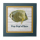 Cette image vintage de Chaetodon reticulatus, communément appelé le Poisson à papillon à la poste ou le Poisson à papillon réticulé ou noir, est un ajout enjoué à votre cuisine ou à votre coin salon. Customisez le texte pour ajouter votre nom ou votre message. Assurez-vous de personnaliser le texte lorsque cela est indiqué. Elle est bordée d'un or complémentaire, d'une orange et d'un bleu turquoise profond. Une tuile similaire avec un triggerfish avec des couleurs similaires est également disponible. Ce poisson se trouve sur les récifs marins exposés et parfois sur les récifs lagunaires peu profonds dans les zones de forte croissance corallienne et d'eau claire. Cette illustration est un dessin vintage de la Bibliothèque du patrimoine de la biodiversité, qui met à la disposition du public plusieurs belles images de la flore et de la faune botaniques.