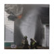 Un carreau de céramique représentant une photo de pompiers luttant contre un incendie de maison.