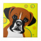 Illustration vectorielle d'un chien Boxer avec des cercles orange clair et un fond jaune.