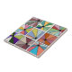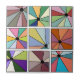 Ce carrelage en céramique a un design abstrait qui est fait de neuf carrés avec un cercle et "rayons" sortant du cercle dans de nombreuses couleurs différentes.