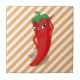 Un personnage de dessin animé rouge et poivre chaud. Design original. Carrelage décoratif personnalisé en céramique. Des rayures orange et blanches dans l'arrière - plan. Idée cadeau.