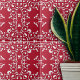 Ce carrelage en céramique est orné d'un riche arrière - plan rouge profond qui contraste avec le motif blanc orné. Le motif central de la conception est une forme diamant symétrique allongée, qui pourrait aussi être interprétée comme une représentation stylisée d'une fleur ou d'une feuille. Cette figure centrale est entourée de motifs tourbillonnants en forme de vigne à motifs de feuilles, ajoutant un sentiment de mouvement et de sophistication à la conception globale. Les coins du carrelage ne sont pas laissés nus mais sont ornés d’éléments de décoration supplémentaires, contribuant à l’esthétique complexe du carrelage. Le contraste de couleurs entre le motif blanc et l'arrière - plan rouge met en évidence chaque détail, ce qui rend la complexité et l'artisanat du design remarquable.