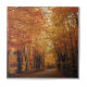 Des arbres d'automne jaune-or bordent un chemin de terre.