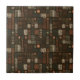 Warm geometric stripe pattern ceramic tile featuring tribal-inspired diamonds, zigzags, and textured vertical bands in earthy brown, terracotta, tan, beige, and charcoal tones. A cozy boho design ideal for southwestern décor lovers, rustic style fans, and anyone drawn to earthy, handcrafted aesthetics.