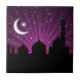 Illustration islamique avec silhouettes de la lune, étoiles et mosquée sur un ciel de nuit violet.