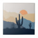 Desert mexicain au lever du soleil illustration avec soleil, montagnes et décoration de cactus en bleu marine, orange, bleu et beige sur arrière - plan gris pastel
