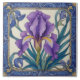 Une fleur d'iris violet aux accents jaunes, entourée de feuilles verts et d'une bordure fleurie bleue, de style Art nouveau, des détails complexes, des couleurs vives, un design élégant.