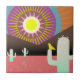 Ce carrelage en céramique coloré possède un brillant soleil du désert qui s'élève derrière des montagnes sombres. Au premier plan, un oiseau jaune est assis sur un cactus. Cette oeuvre d'art du sud-ouest ajoutera de la couleur à votre décor.