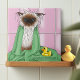 Un chat siamois tremble mouillé d'avoir un bain. Le chat a une serviette verte autour d'eux et leur canard en caoutchouc sur fond de carreaux de bain roses. Le chat n'est pas heureux du bain.