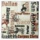 Cette tuile présente les noms de plusieurs villes du Texas, y compris Dallas, San Antonio, Abilene, College Station, Waco, Galveston, Houston, Austin, Corpus Christi, et plus. De plus, il y a des images d'éperons et de broncos cassants pour lui donner une impression occidentale certaine. L'image est en brun, noir, brun et blanc cassé. Unique !
