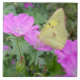 Une photographie d'un papillon assez jaune et des fleurs roses de géranium, montrée sur une tuile. --- La photographie est garantie les droits d'auteur et je suis le propriétaire de cette photographie.